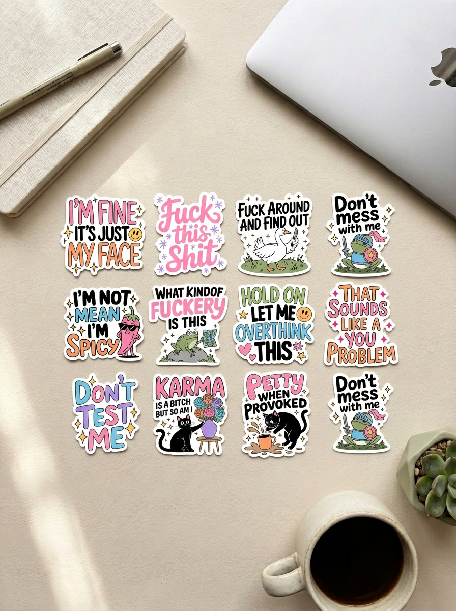 See komplekt sisaldab 12 naljakat kleepsu, millel on teravad ja sarkastilised sõnumid. Need stickerid sobivad ideaalselt sülearvutile, veepudelile, märkmikule, reisikohvrile või telefoniümbrisele.