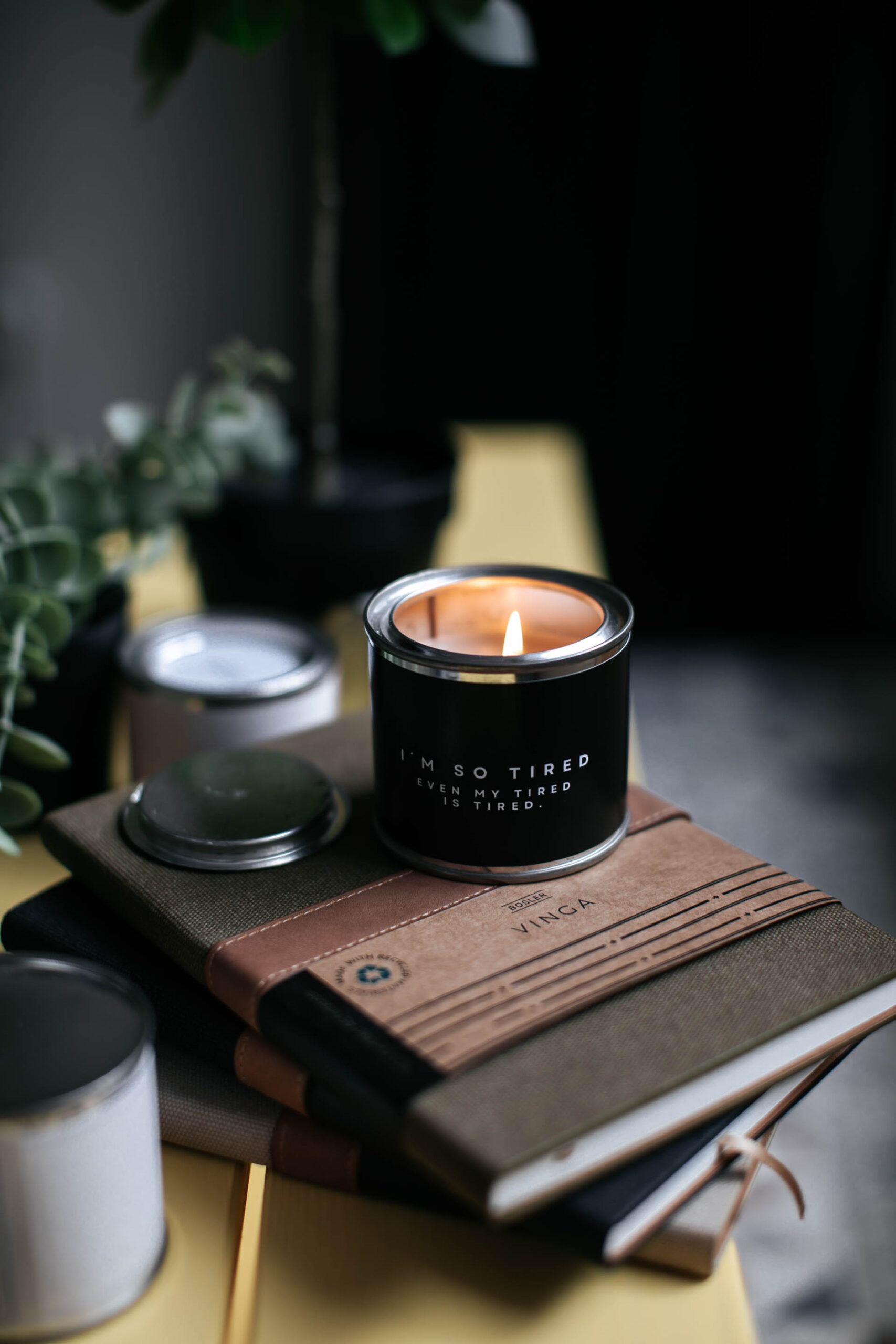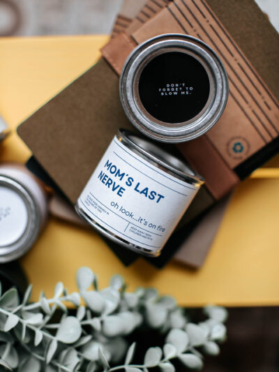 Öko-sojavahast käsitööküünal plekkpurgis, erinevate sõnumitega.